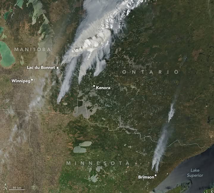 कनाडा में मैनिटोबा-ओंटारियो सीमा और उत्तरी मिनेसोटा में जंगल में आग लग गई।