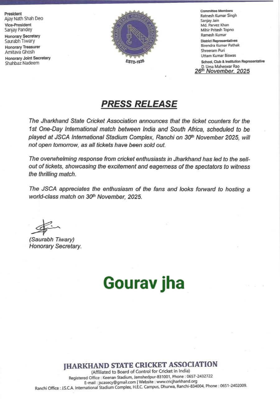 झारखंड स्टेट क्रिकेट एसोसिएशन ने घोषणा की है कि भारत और साउथ अफ्रीका के बीच 30 नवंबर 2025 को रांची के JSCA इंटरनेशनल स्टेडियम कॉम्प्लेक्स में होने वाले पहले वन-डे इंटरनेशनल मैच के टिकट काउंटर कल नहीं खुलेंगे, क्योंकि सभी टिकट बिक चुके हैं।